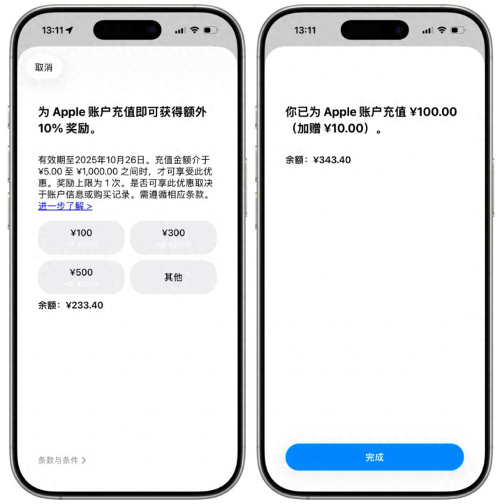 值得注意的是,此次活动的参与门槛虽然低,但策略性很强。苹果明确限制每个账户仅能享受一次优惠,且单次充值上限为1000元。这意味着用户需要在“试水”和“最大化优惠”之间做出权衡——如果首次只充值小额金额,将无法再次享受返利机会。
